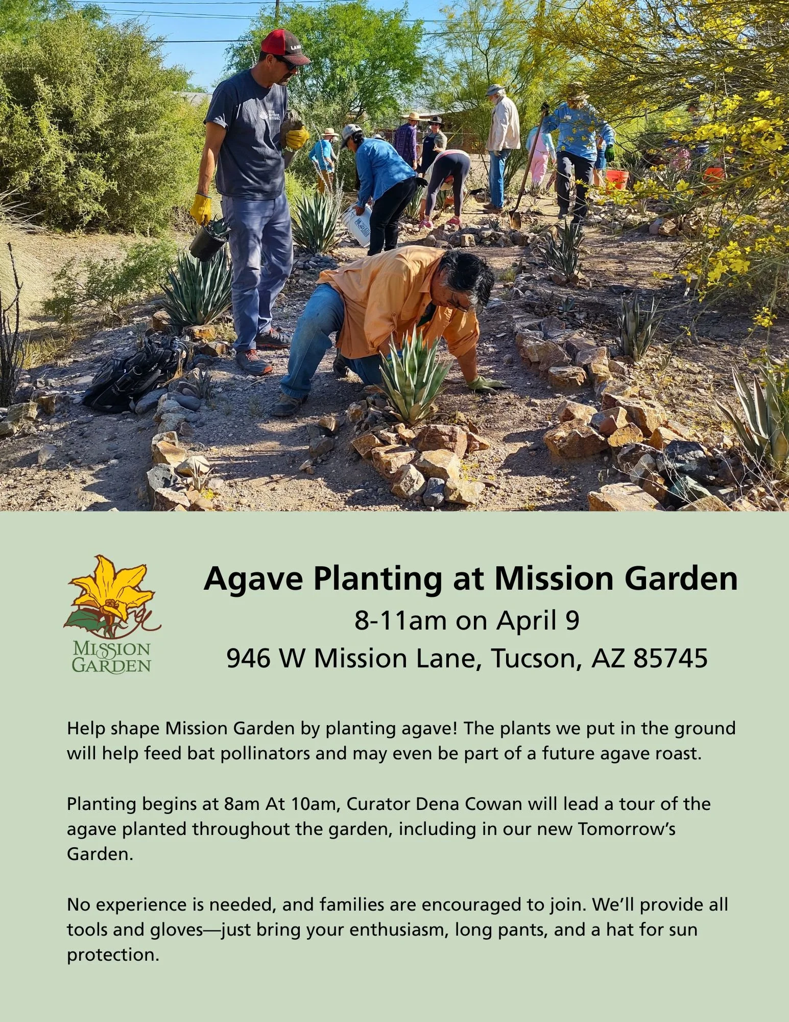 Be part of history and the future! Join us at Mission Garden to plant agave in the traditional Hohokam style, inspired by ancient plantings on Tumamoc Hill. These agave plants will provide food for bat pollinators and may even become roasted at a future festival.