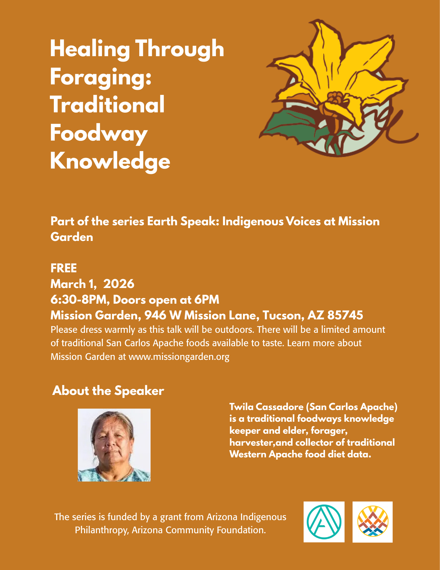 “Healing through Foraging,” a talk on Indigenous food sovereignty by Twila Cassadore (San Carlos Apache), traditional food forager.