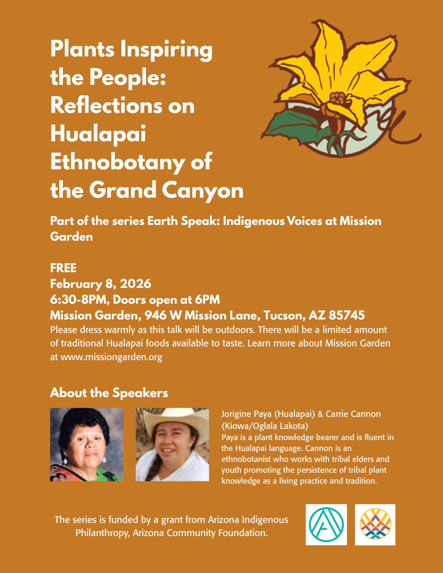 Please dress warmly as this talk will be outdoors. There will be a limited amount of traditional Hualapai foods available to taste.